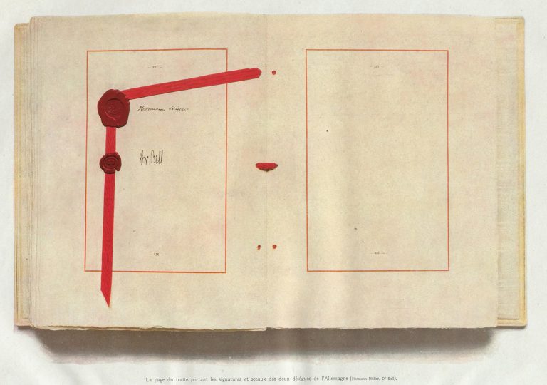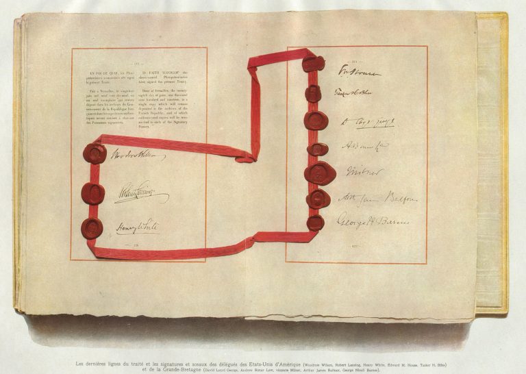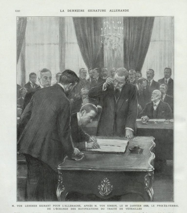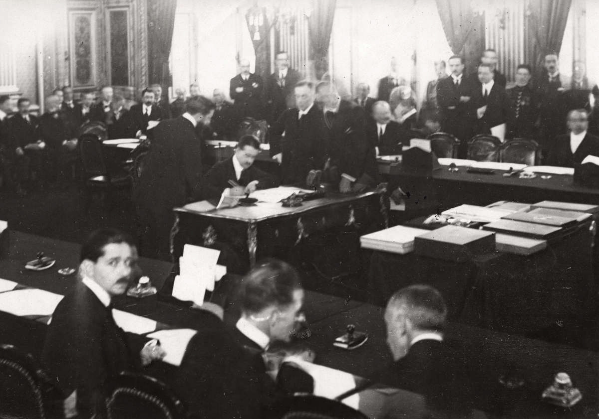 La 28 iunie 1919, la Palatul Versaillles, în Galeria Oglinzilor, s-a desfășurat ceremonia de semnare a Tratatului de Pace între Puterile Aliate și Asociate și Germania. Tratatul avea 300 de pagini și XV părți, prima parte era Pactul Societății Națiunilor, întâia organizație internațională apărută la ideea președintelui american W. Wilson; în cea de-a II-a parte erau trasate Frontierele Germaniei, care restituia Alsacia și Lorena, Franței, pierzând o optime din teritoriu; în partea a-III-a, Clauze politice europene se stabilea demilitarizarea statului german; în partea a IV-a Drepturile și interesele Germaniei în afara teritoriului german se prevedea pierderea tuturor coloniilor; apoi urmau partea a- V-a Clauze militare, navale și aeriene; VI – Prizonieri de război și morminte; VII – Sancțiuni; VIII – Reparații; IX Clauze financiare; X Clauze economice; XI Navigație aeriană; XII Porturi, căi navigabile și căi ferate; XIII Muncă – regrementări privind numărul maxim de ore de muncă, pensii, asigurări medicale; XIV Garanții de executare și XV Clauze diverse.