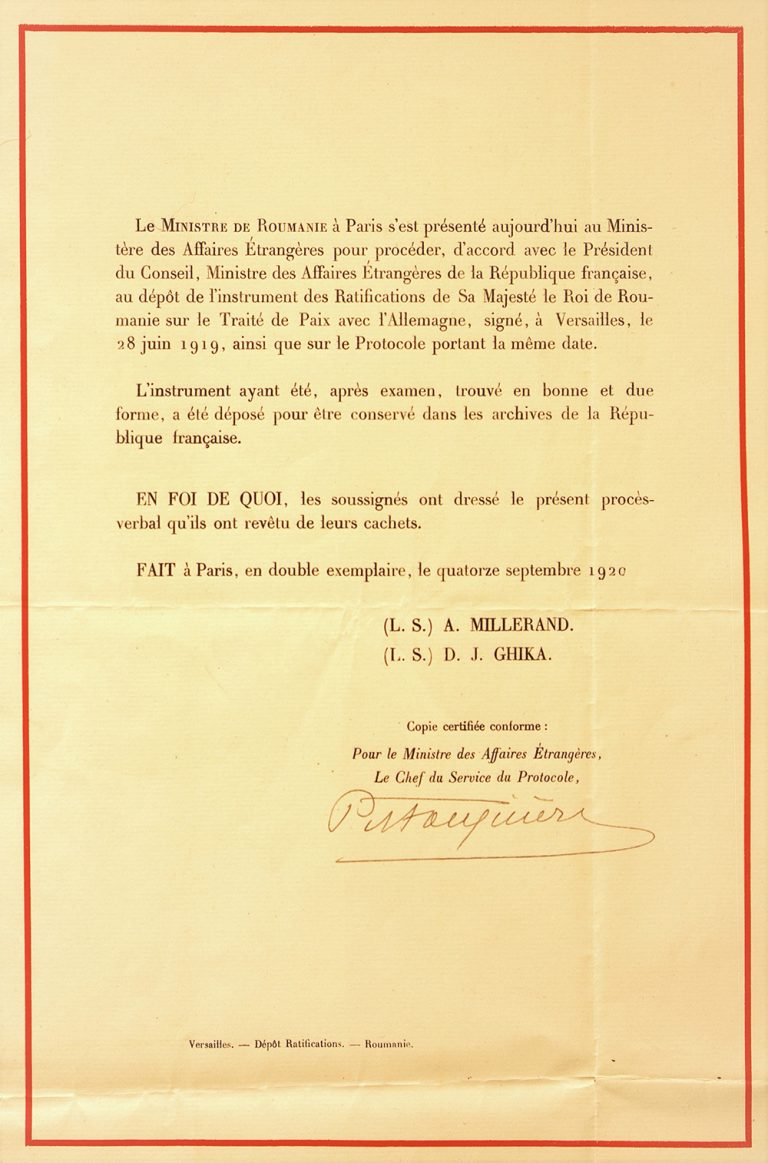 Delegația română, în frunte cu Ion I.C. Brătianu, a semnat, la 28 iunie 1919, Tratatul de Pace dintre Puterile Aliate și Asociate și Germania.