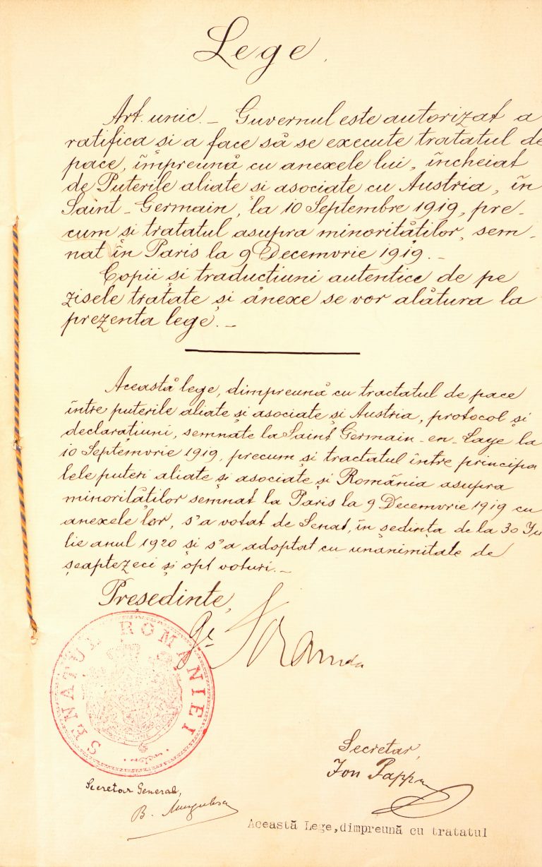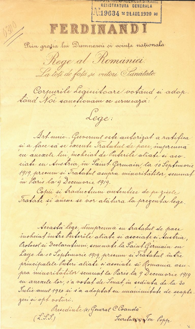 Legea din 30 august 1920 prin care, după votarea de către Corpurile legiuitoare, regele Ferdinand I cere guvernului să pună în aplicare Tratatul de pace încheiat  între Puterile Aliate și Asociate și Austria, la Saint Germain en Laye, la 10 septembrie 1919 și Tratatul asupra minorităților semnat la Paris la 9 decembrie 1919, AMAE