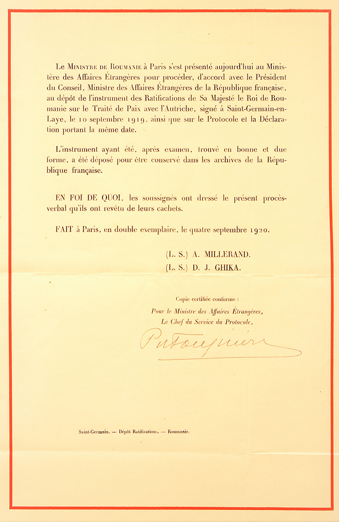 Depunerea instrumentelor de ratificare a Tratatului de Pace cu Austria, de la Saint Germain en Laye, de către ministrul României la Paris, 4 septembrie 1920 , AMAE