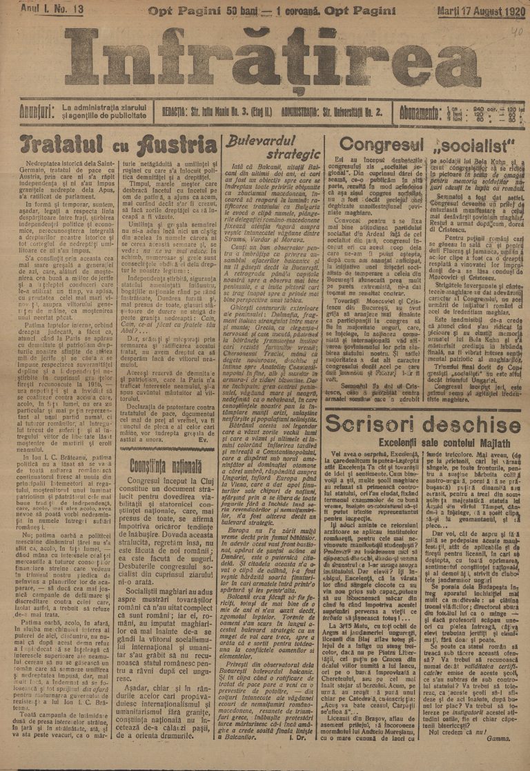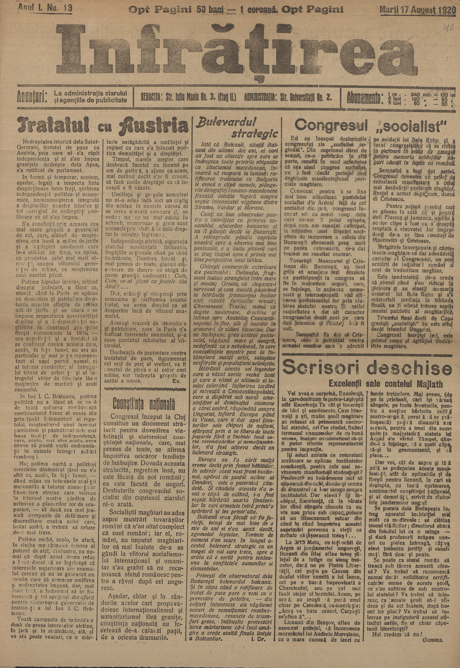 Ziarul „Înfrățirea” despre „Tratatul de Pace cu Austria”, 17 august 1920