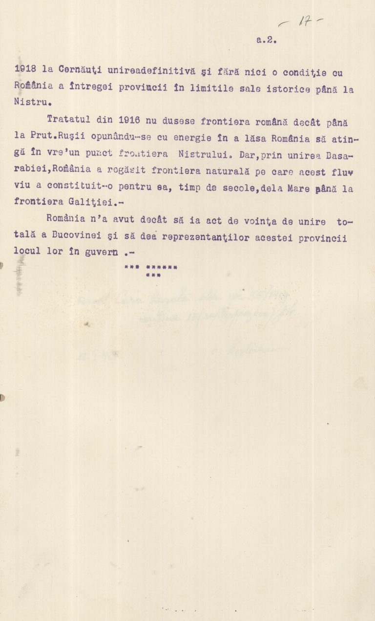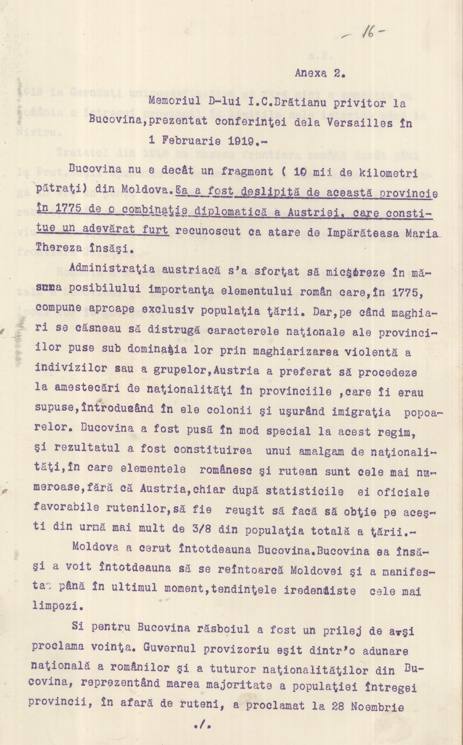 Memoriu al lui  Ion I.C. Brătianu privitor la Bucovina, prezentat în fața Conferinței de la Versailles, la 1 februare 1919, ANR, SANIC, fond Casa Regală, dosar 35/1919
