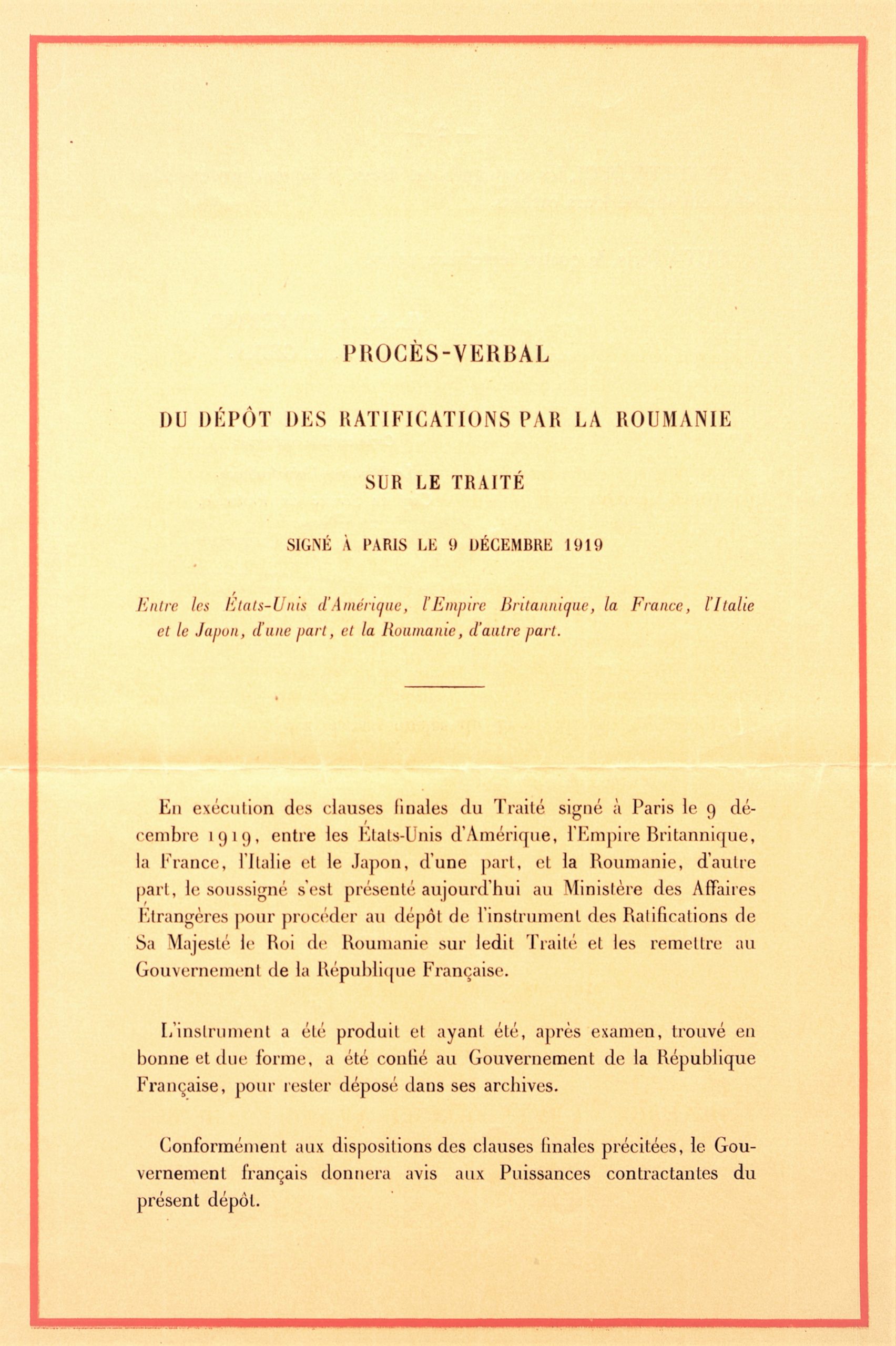 Instrumentele de ratificare ale Tratatului între Principalele Puteri Aliate și Asociate și România în problema minorităților depuse la Paris la 4 septembrie 1920, AMAE
