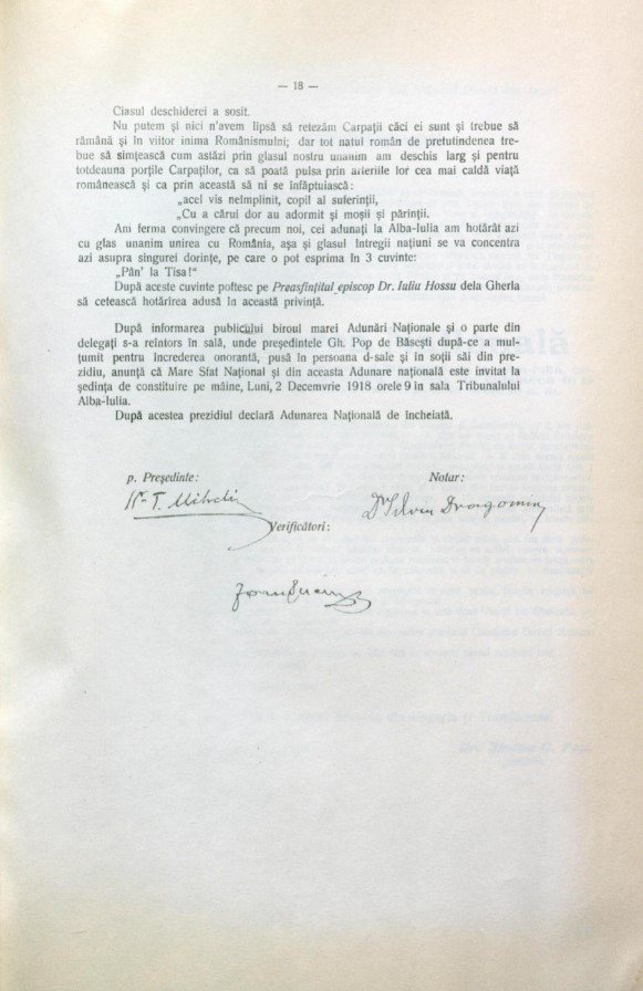 Iuliu Maniu spoke urging delegates to adopt the draft resolution, and Iosif Jumanca presented the Social Democrats’ adhesion to the union. After the speeches, the president Gh. Pop de Băseşti submitted for approval the resolution of the Union which was adopted with the unanimity of the votes.